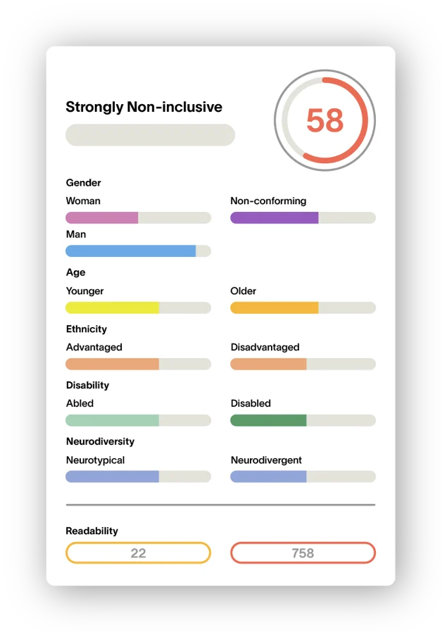 Develop Diverse helps you attract a wider talent pool with science-backed, inclusive language, making your brand more appealing to top candidates. Our editor goes beyond gender decoding to detect and eliminate all biases related to: